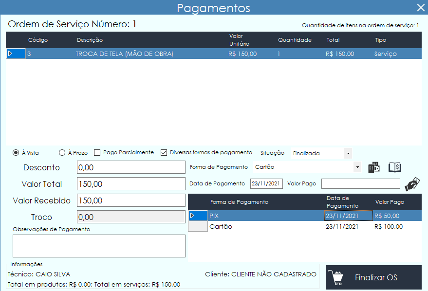- Múltiplas formas de pagamento em uma mesma venda ou OS