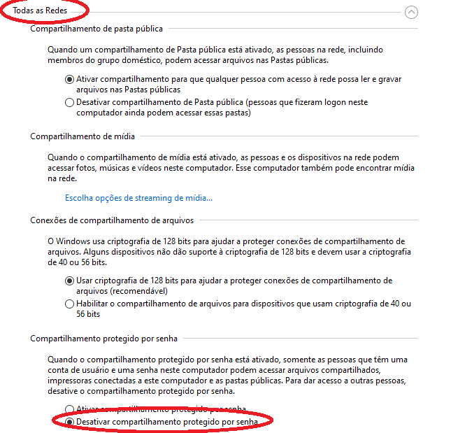 Dica: Você pode ir até Todas as redes e marcar a opção “desativar compartilhamento protegido por senha“. Desta forma você não precisará colocar a senha todas as vezes que for acessar o compartilhamento.