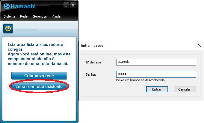 Para acessar o compartilhamento que criamos, instalamos o Hamachi em cada um deles, depois, acessamos com nossa conta. Feito isso, vamos clicar em “Entrar em uma rede existente“.