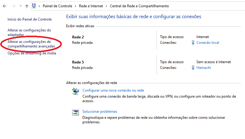 Para começarmos vamos até painel de controle > Rede e Internet > Central de rede e Compartilhamento. Depois clicamos em “Alterar as configurações de compartilhamento avançadas“.