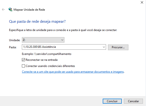Selecione a unidade do mapeamento e digite o caminho de acesso, “\\ Código da rede“, Por exemplo: \\10.20.300. Depois clique em “Concluir”