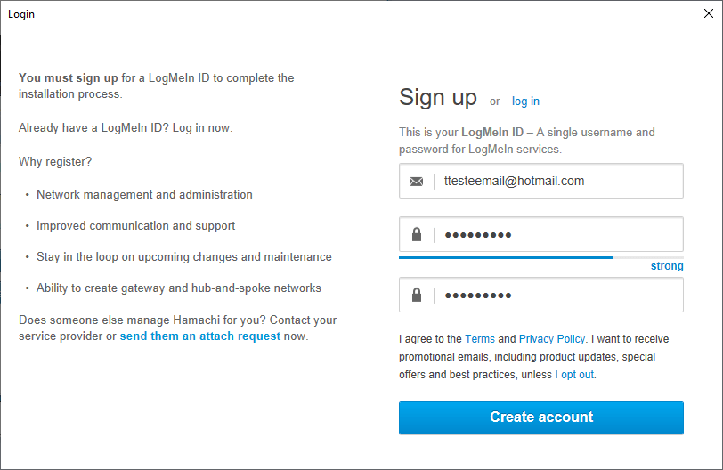 Caso tenha clicado em “sign up” o Hamachi irá abrir a tela de criação de conta. Para isso basta colocar seu endereço de e-mail e sua senha. Depois, clique em “Create account“. Conforme o exemplo abaixo.