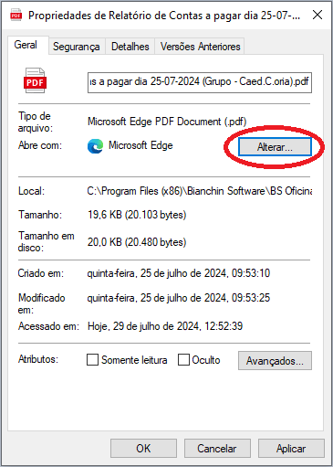 No campo “Abre com:” clique no botão alterar. Feito isso basta selecionar o leitor de sua preferência.